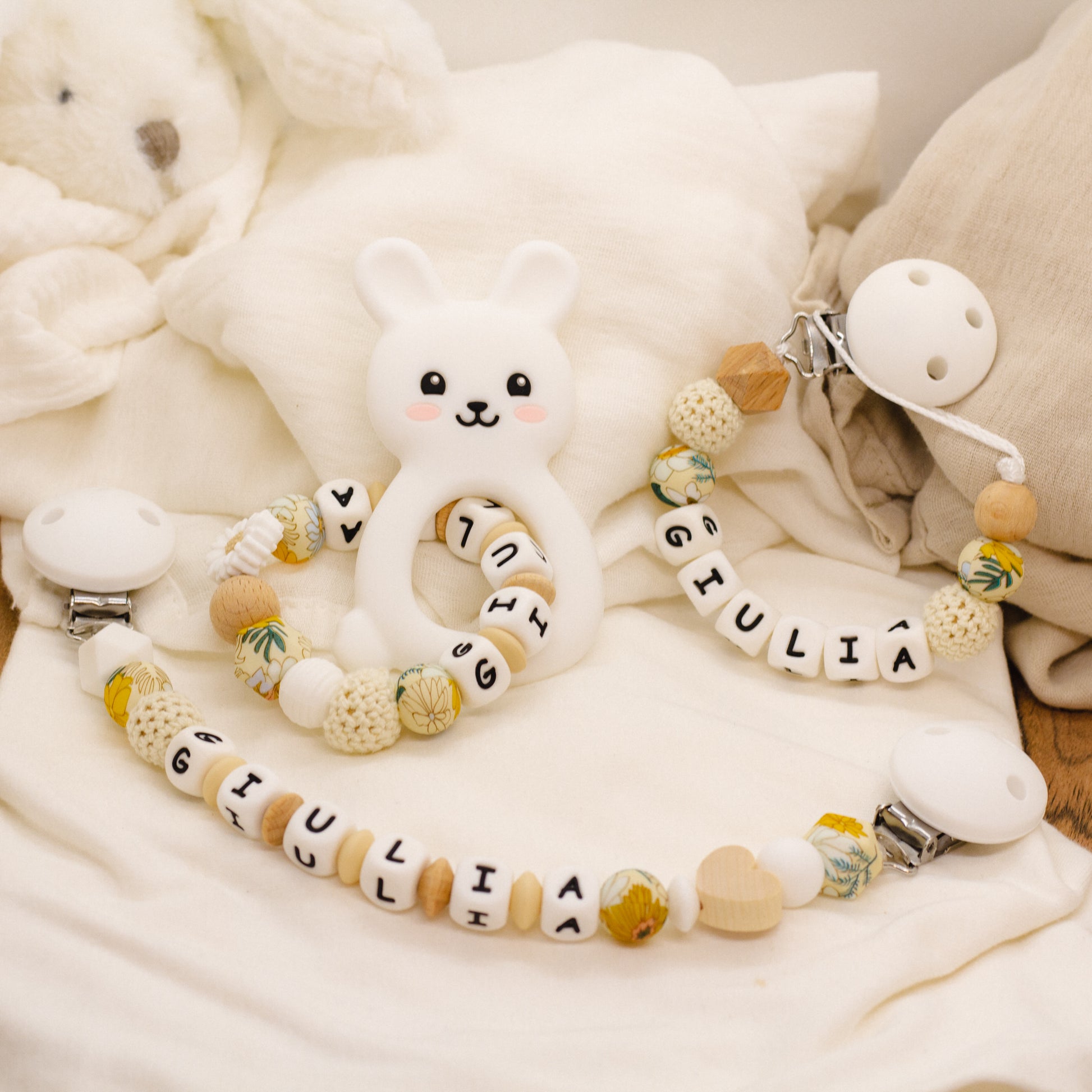 Le coffret Giulia se compose d'une attache tétine, d'une attache doudou et d'un anneau de dentition.