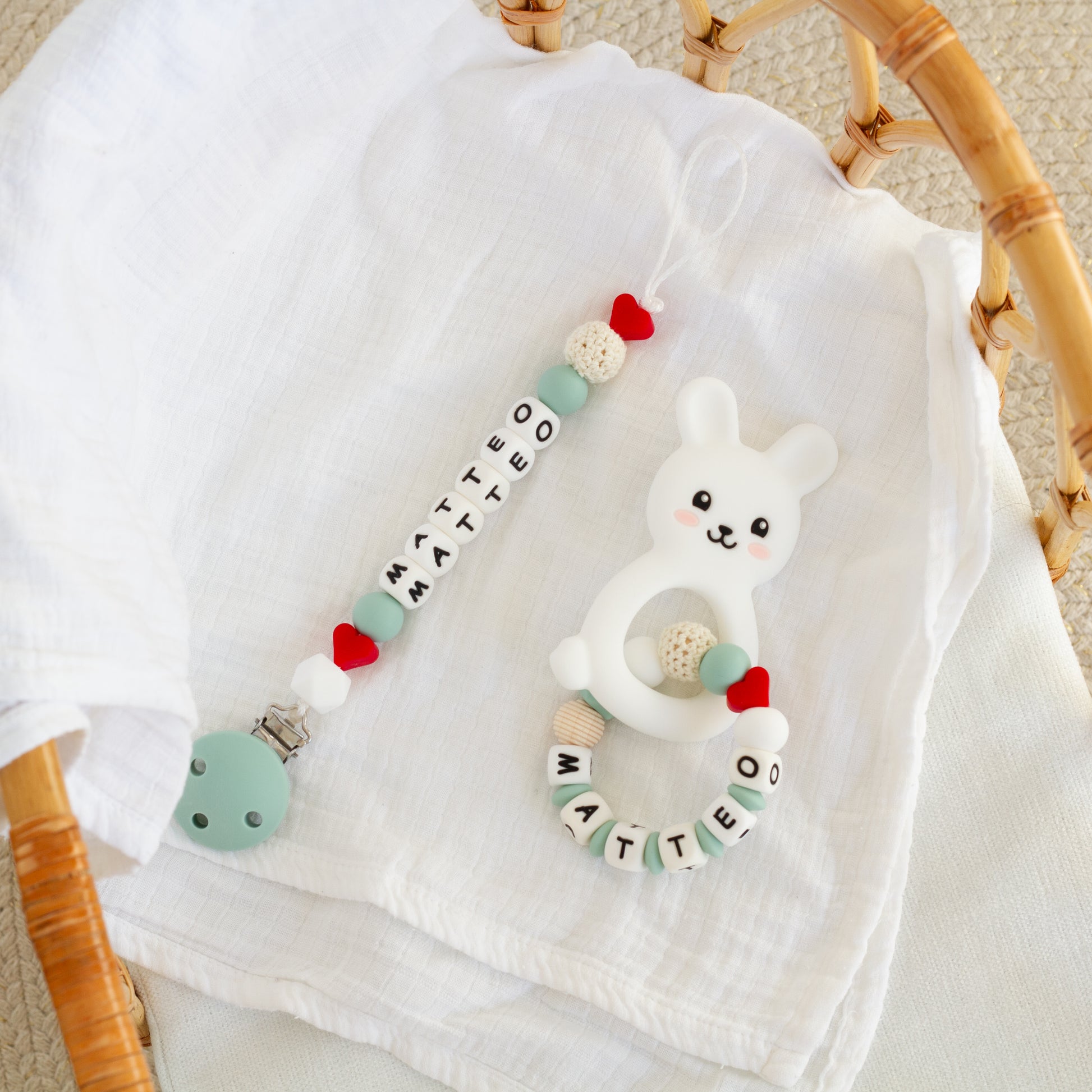 Notre coffret duo se compose d'une attache tétine et d'un anneau de dentition.