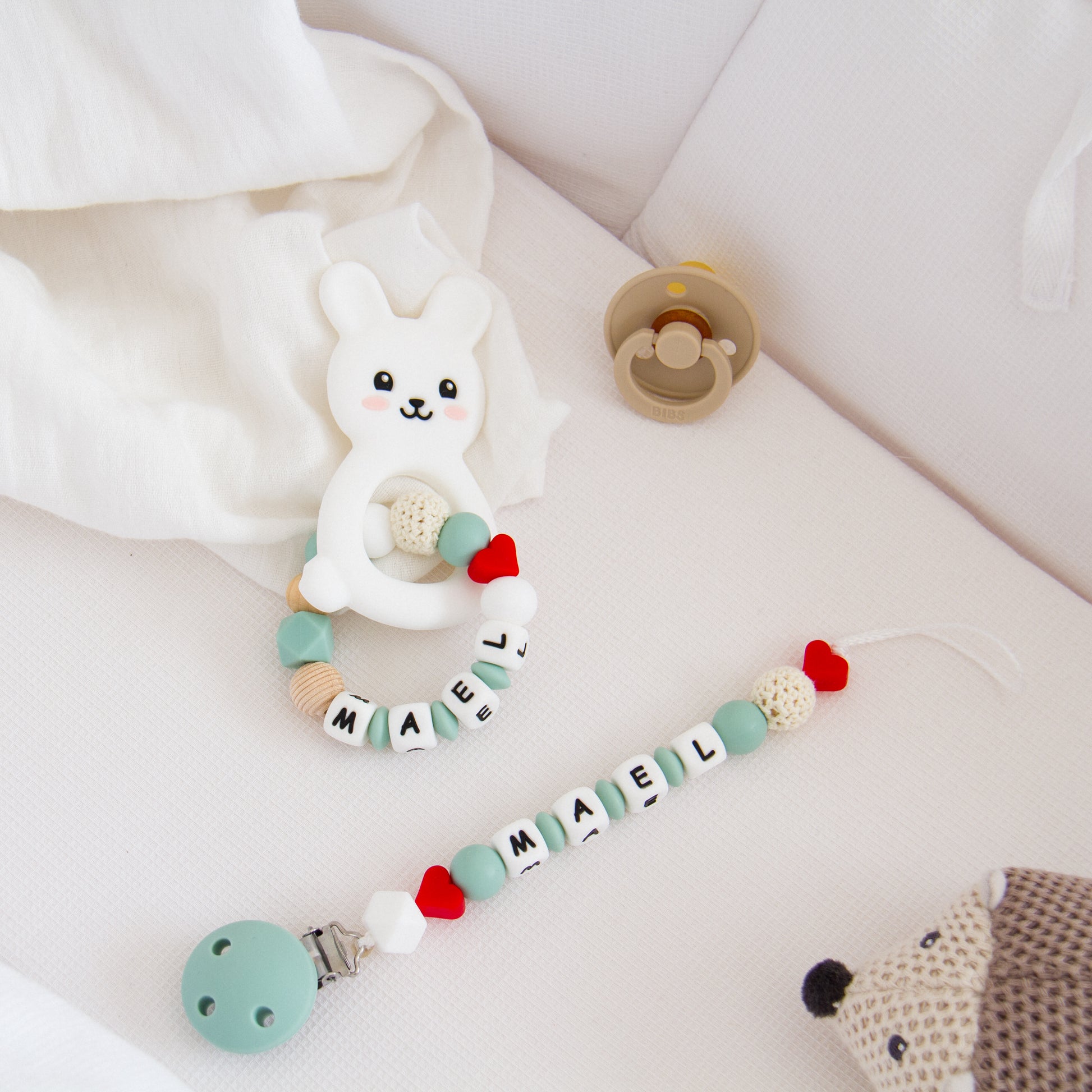 Soucieux de la sécurité de votre bébé les attaches tétines et les anneaux de dentitions sont réalisés dans notre atelier avec le plus grand soin.